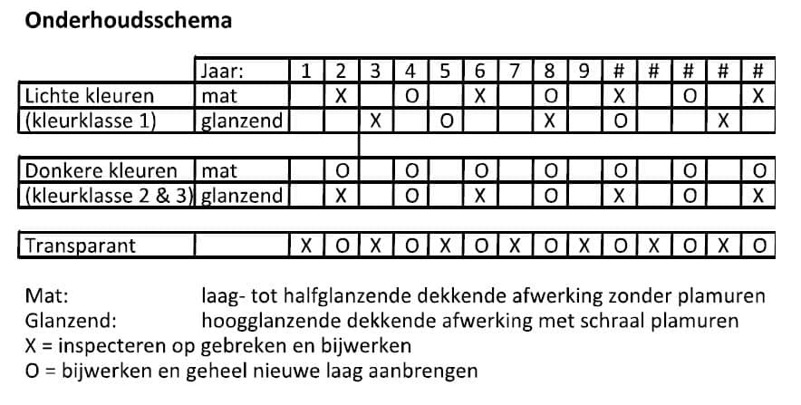 op deuren, voorzien van kleuren uit klasse III alsmede deuren die transparant zijn afgewerkt, met ingang van 2016 uitgesloten. Onderhoudsschema (eigenaar/bewoner): Afhankelijk van de omstandigheden waaraan de deur bloot staat moet periodiek deskundig onderhoud plaats vinden. Indicatief kan onderstaand schema worden aangehouden. Nadat de glaszetter en schilder de werkzaamheden hebben afgerond dan wordt de zorg voor de deur aan u overgedragen. Algemeen geldt dat het schilderwerk op zogenaamde liggende delen (o.a. bovenzijde van glassponning, de weldorpel) eerder aan onderhoud toe is dan op verticale vlakken.
